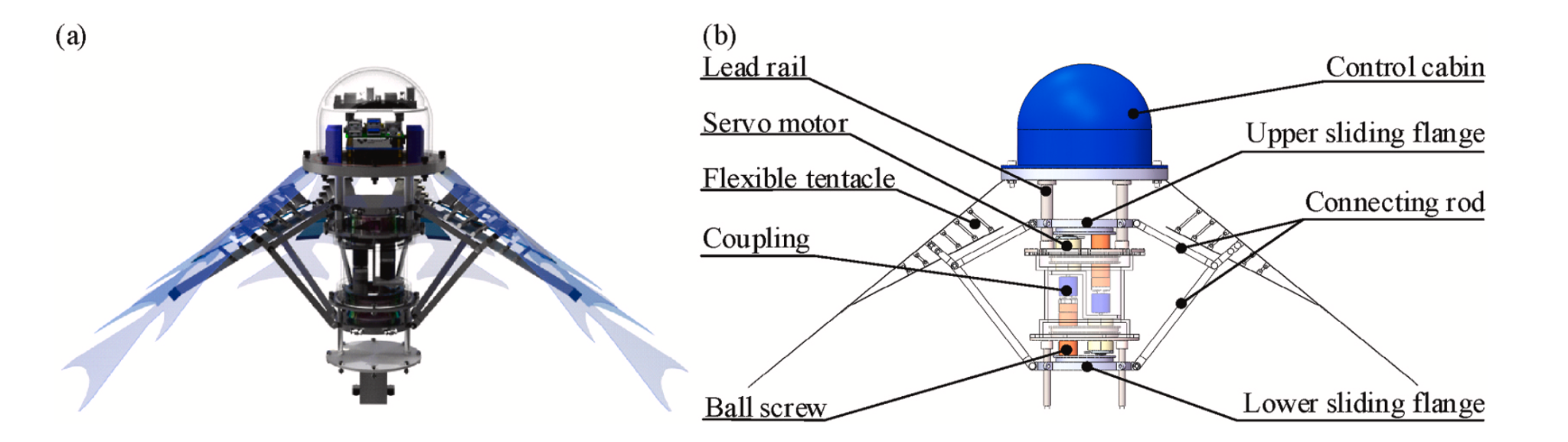 The vehicle system uses two servo linear drive modules to power a linkage mechanism that fluctuates eight flexible tentacles, mimicking jellyfish motion for propulsion. The tentacles, made from 0.5-millimeter-thick unplasticized polyvinyl chloride and incorporating the FinRay effect, feature a double crescent tail fin end to enhance thrust. As shown in Fig. 2, the overall structure includes a hemispherical control cabin housing remote control devices and power supplies, with a drive cabin below containing staggered servo motors connected to ball screws and sliding flanges.