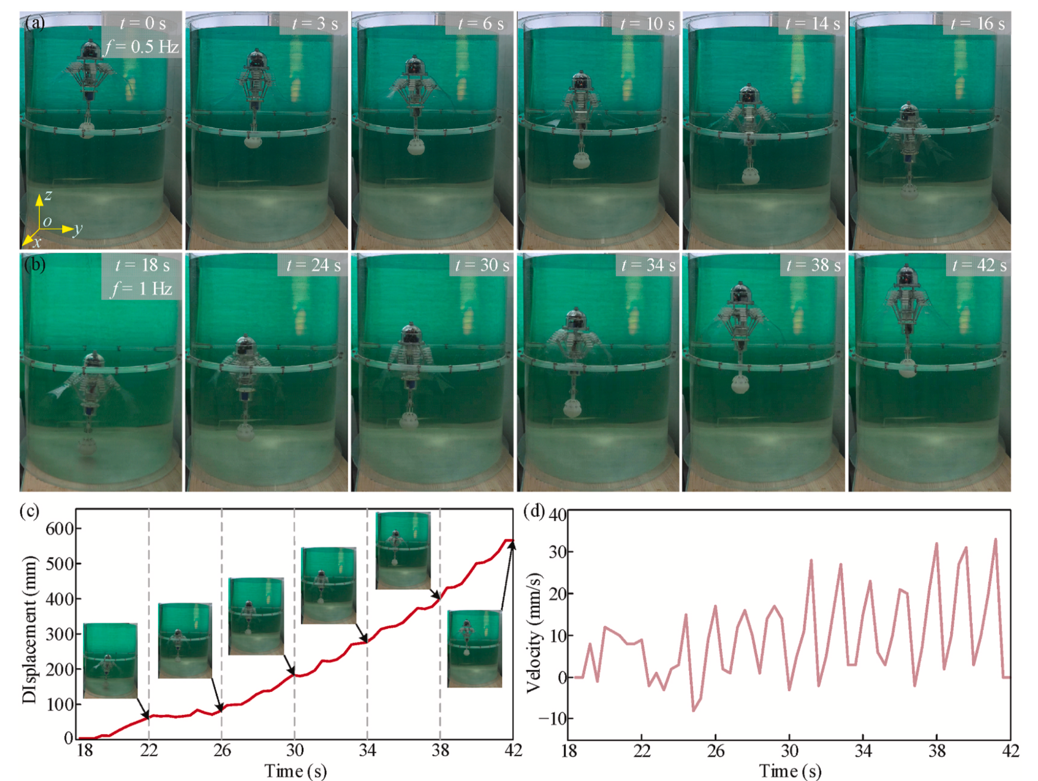 A Raspberry Pi-based control system enables wireless operation of the vehicle and gripper, with servo drives adjusting motor speeds and hall sensors providing feedback. The 2270-gram prototype, with a relaxed diameter of 662 millimeters, undergoes underwater tests. Descending at 0.5 hertz takes 16 seconds over 580 millimeters, while ascending at 1 hertz reaches 33.2 mm/s velocity and 27 mm/s² acceleration, as depicted in Fig. 20.