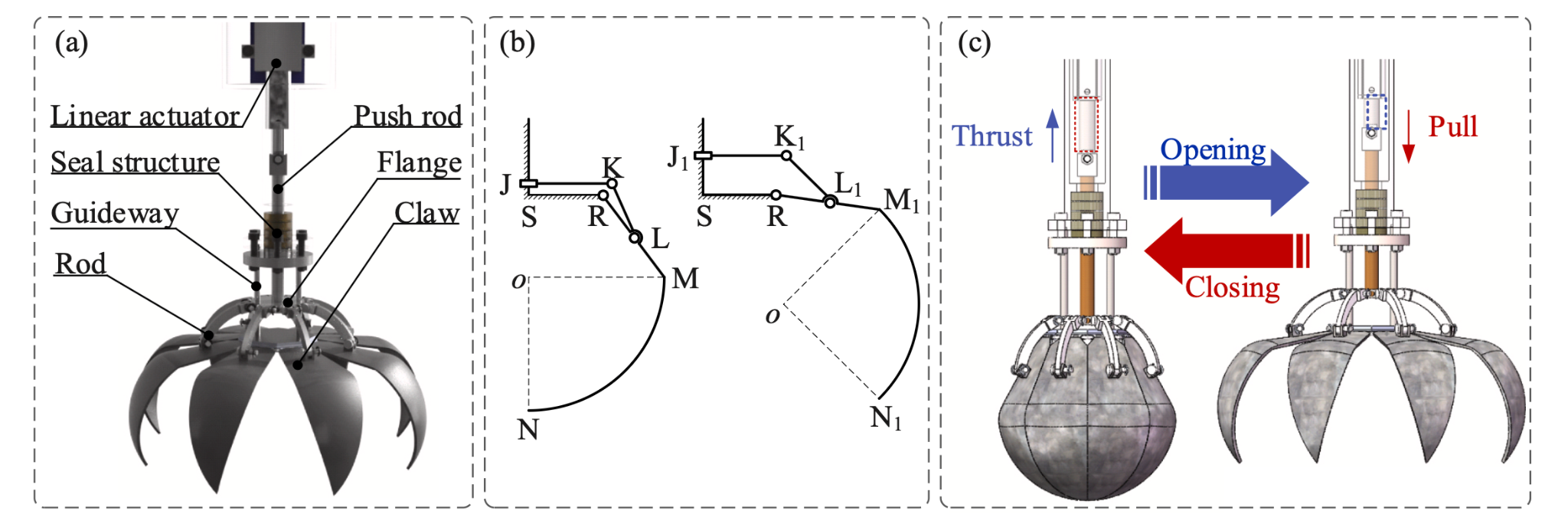This design adapts to smooth polymetallic nodules, reducing sample shedding risk during ascent. To optimize the transmission mechanism, the authors use multibody dynamics in ADAMS and MATLAB, targeting maximum tentacle swing and minimum power consumption. Six coordinate variables define rod lengths, yielding an optimized swing amplitude of 37.3 degrees at 13.89 watts, a 24.3 percent increase in amplitude and 7.4 percent reduction in power compared to initial values of 30 degrees and 15 watts.