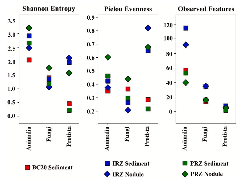 Figure 6 summarizes within-sample diversity and richness using only the ASVs assigned to at least the phylum level. In the authors’ interpretation, Shannon diversity is higher in nodule samples than sediments for metazoans, fungi, and protists, while IRZ samples contain more observed features than PRZ and BC20. Rarefaction results qualify the meaning of these differences: richness curves for sediments continued to rise even at 774,889 reads per sample, while Shannon entropy curves plateaued at the minimum post-DADA2 frequency, suggesting that sequencing depth was sufficient to stabilize diversity estimates for the assigned taxa but that added sampling could still reveal additional features, particularly in sediments.