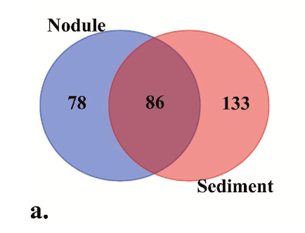 Figure 2a provides a compact summary of substrate differentiation within the analyzed subset. Of the 297 phylum-assigned ASVs, 86 were shared between nodules and sediments, 78 were unique to nodules, and 133 were unique to sediments. This supports the paper’s main ecological point that nodules, as hard substrates embedded in an abyssal soft-sediment landscape, host a partially distinct community signal rather than merely reflecting surrounding sediments.