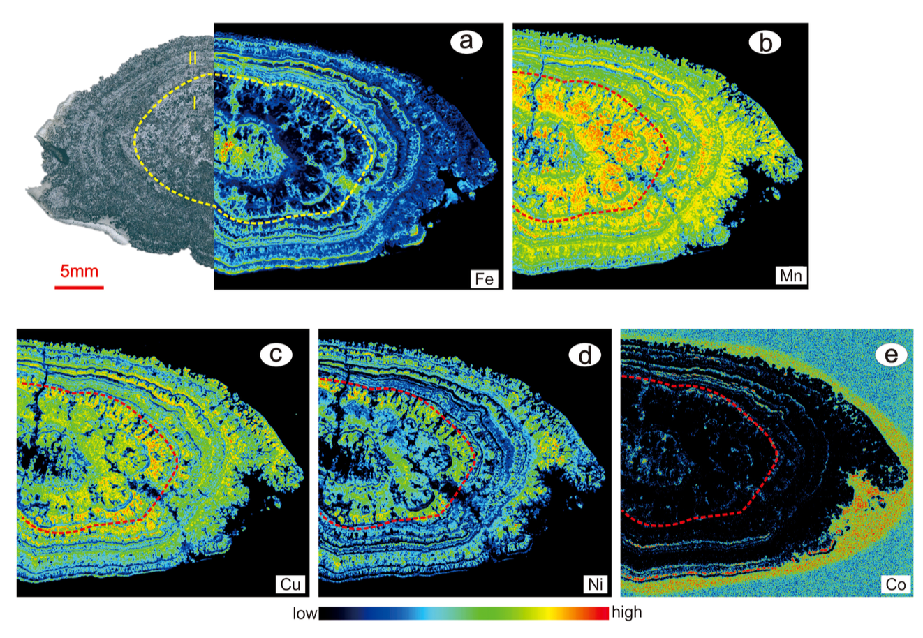 BC06 contains two layers, with a detrital, porous core and a porous dendritic rim. BC1901 contains three layers, transitioning from massive inner textures to laminated middle layers and a dendritic outer shell. As the study’s micro-XRF element maps figure shows, Mn, Ni, and Cu dominate most of BC06, with only thin Fe-rich laminae in the outer layer.