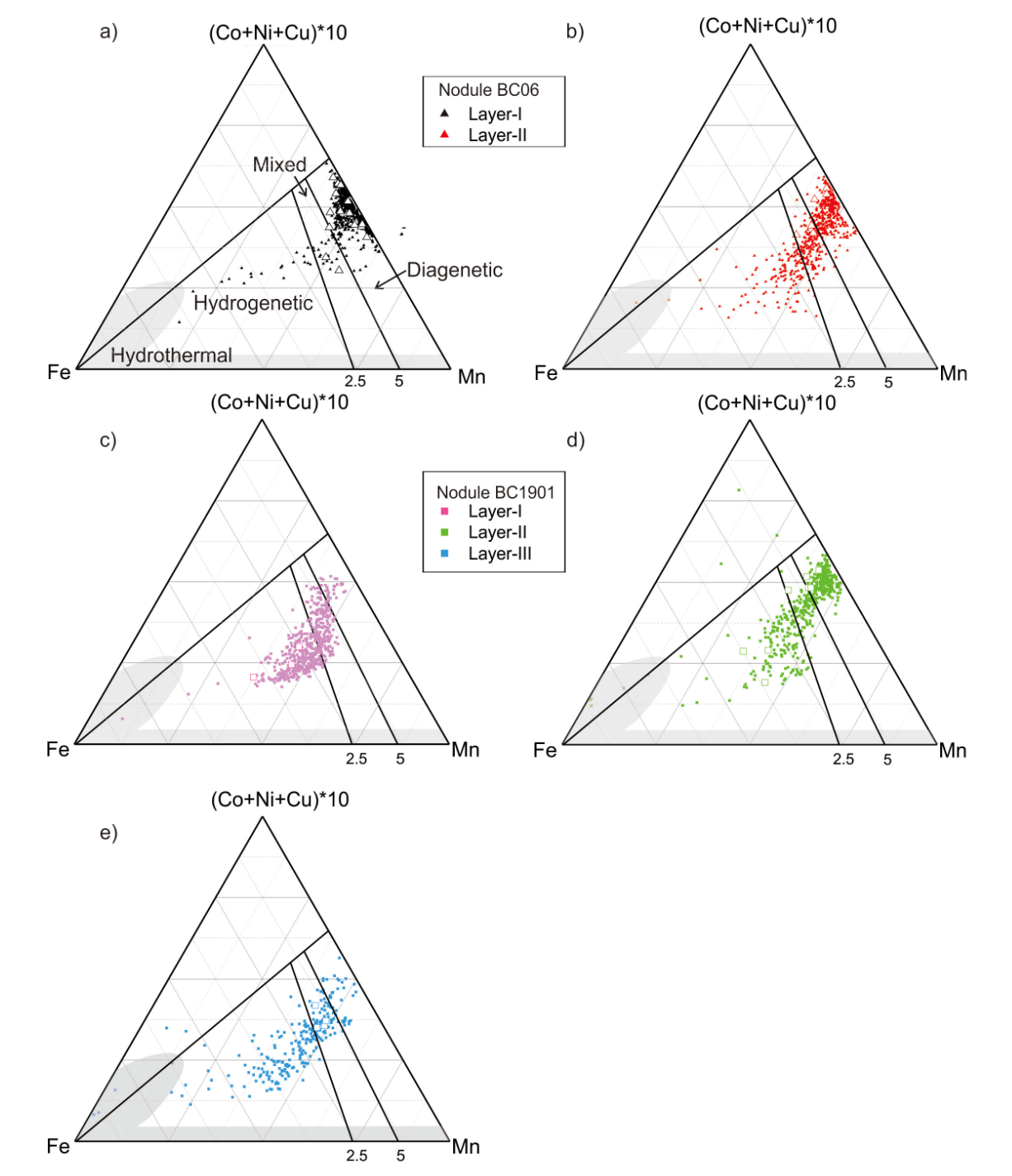 Across both nodules, Mn can reach about 35.97 wt percent, Cu about 2.52 wt percent, and Ni about 2.87 wt percent in Mn-rich layers, whereas Fe and Co in those same layers can fall to about 0.74 wt percent and 0.01 wt percent, respectively. The highest Mn/Fe observed is about 44.79. In BC06, the inner Layer I shows the strongest diagenetic signature with Mn/Fe up to 44.78 and Ni+Cu up to 5.30 wt percent, while the outer Layer II shifts toward a mixed hydrogenetic–diagenetic field. In BC1901, Layer I is hydrogenetic with Fe-rich vernadite and low Mn/Fe, with a maximum of 1.82; Layer II becomes more diagenetic, and Layer III trends back toward more hydrogenetic conditions. The Fe–Mn–(Ni+Cu)×10 ternary-diagram figure in the paper shows BC06 plotting closer to the diagenetic or mixed fields and locates BC1901 Layer I squarely in the hydrogenetic field, with Layers II and III spanning mixed space.
