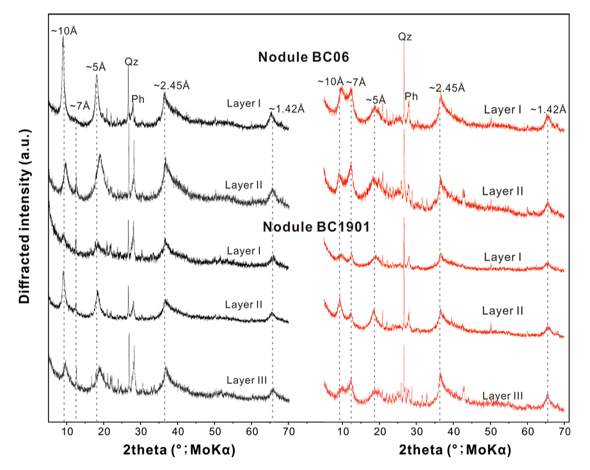 XRD confirms the phase story. The diffractogram figure demonstrates that the 10 Å peak is sharpest in BC06 Layer I and in BC1901 Layer II, marking intervals with the most ordered 10 Å phyllomanganates and stronger diagenetic input. Heating to 105 °C collapses much of the 10 Å signal to 7 Å, identifying a large fraction of buserite I, while residual 10 Å signals indicate stable buserite II or todorokite. Layer I of BC1901 lacks a strong 10 Å peak and is Fe-rich, consistent with hydrogenetic vernadite.
