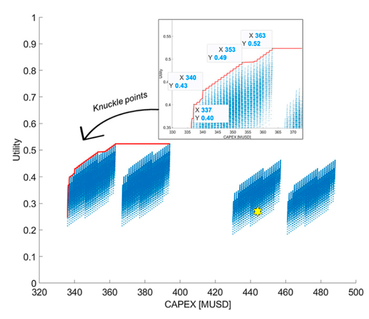 Across many epochs, the study concentrates on the left cluster of solutions where utility rises faster than cost and identifies three knuckle-point designs that consistently balance capability and affordability. These designs push deck area and deadweight to their maximum values to support equipment handling and storage.