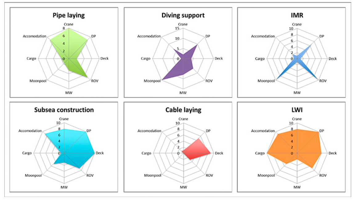 Figure 4 maps offshore special-purpose vessels and their main features, framing which systems (for example pipe racks, ROV hangars, LWI towers) migrate well into mining-ship configurations. This sets the technology menu that the tradespace explores.